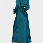 Ženska, elegantna i s rafiniranim prisustvom, haljina Marija kombinira fluidnu maxi siluetu s strukturiranim visokim ovratnikom i suknjom s cvjetnim detaljima. Njen dizajn je idealan za one koji žele istaknuti sofisticiranost u posebnim prilikama bez odricanja od udobnosti.