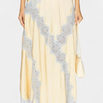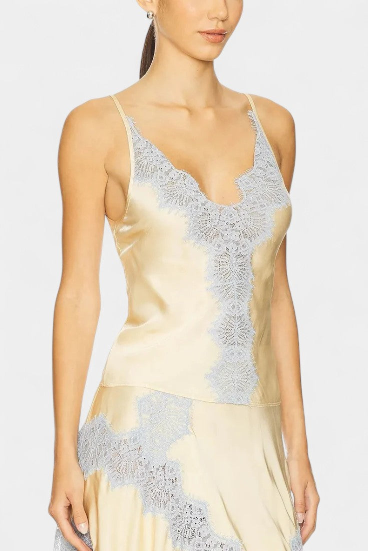 Sofisticirani set koji kombinira svilen sjaj satena s romantičnim detaljima za chic izgled bez napora. Danica se ističe majicom bez rukava s tankim naramenicama i laskavim izrezom, uravnoteženom fluidnom midi suknjom koja donosi prirodni pokret. Kontrast čipke u delikatnim tonovima dodaje retro francuski naglasak, pretvarajući ovaj dizajn u rafiniranu i svestranu ponudu.