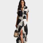 Ova maxi košulja-haljina od laganog šifona stvorena je za žene koje žele udobnost i sofisticiranost u isto vrijeme. Geometrijski uzorak i klasični ovratnik s kratkim rukavima pružaju svježinu i eleganciju, dok prozračan materijal omogućava lako nošenje tijekom cijelog dana.