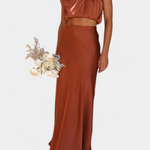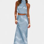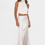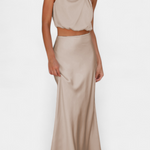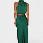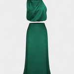 Vibrantna i upečatljiva, ova kombinacija suknje dizajnirana je da se istakne sa svojim drapiranim topom s halter izrezom, delikatnim detaljima i siluetom koja elegantno teče. Pruža lagan i sofisticiran osjećaj koji se divno kreće s tobom.