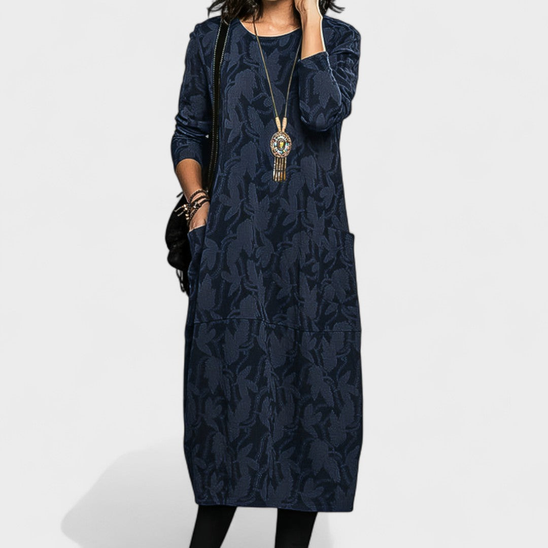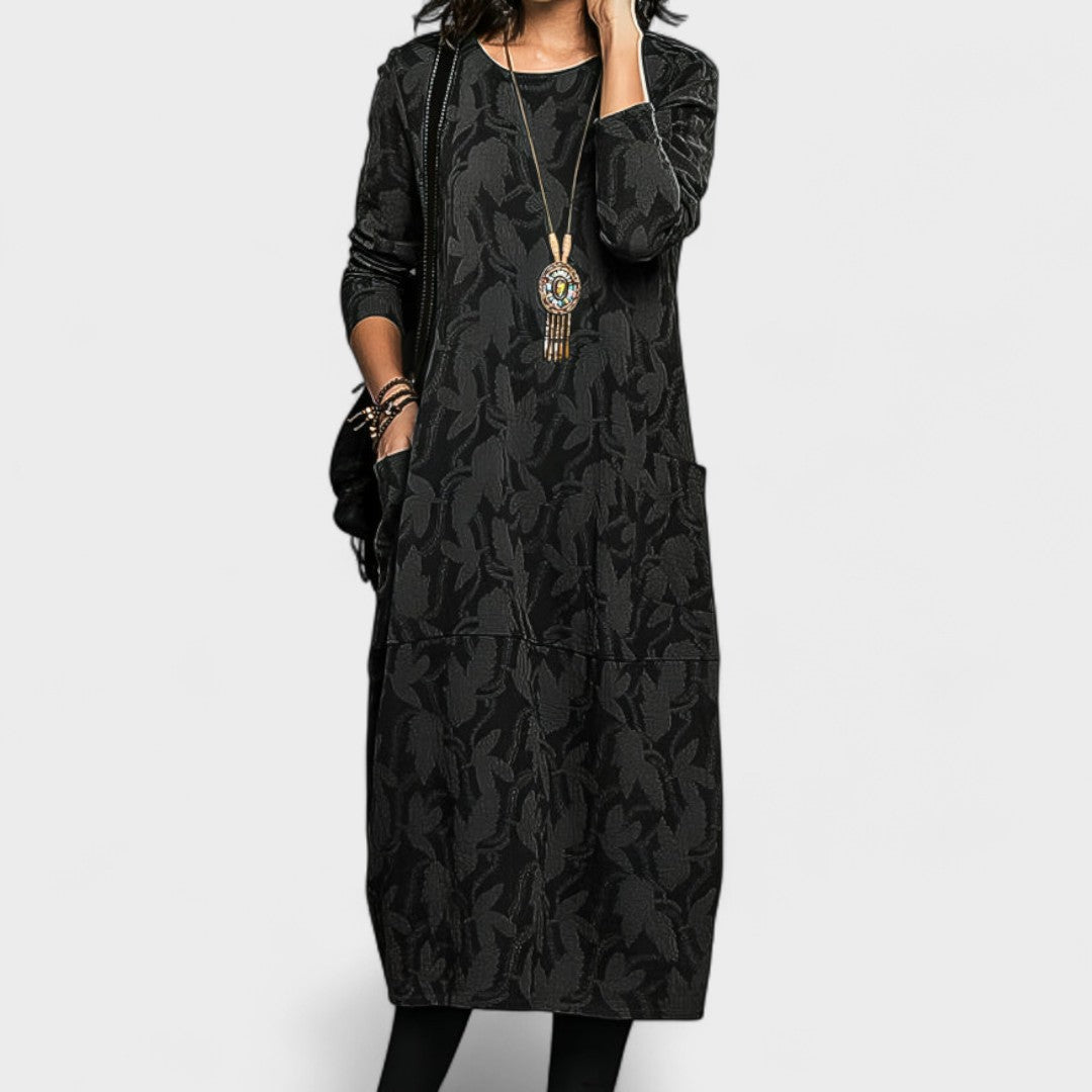 Ova jesenska haljina savršen je izbor za žene koje žele spojiti udobnost i eleganciju u svakodnevnom stilu. Izrađena od mekanog i toplog materijala, s dugim rukavima i praktičnim džepovima, nudi maksimalnu udobnost tijekom hladnijih dana. Ležeran kroj osigurava slobodu kretanja, a diskretan uzorak daje dašak posebnosti. Idealna za šetnje, posao ili opuštena druženja.