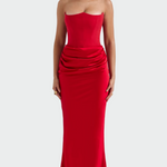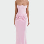 Impozantna i senzualna haljina s strapless korzetom i uskim krojem koji ističe siluetu. Detalj s elegantnim nabranim pojasom donosi ženstvenost i jedinstveni fluid, dok maksi dužina pruža bezvremensku eleganciju. Idealna za svečane večeri i blistave nastupe.