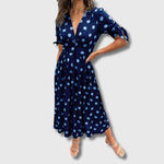 Monique haljina spaja klasiku i suvremenost – uzorak na točkice unosi razigranost, dok profinjeni kroj naglašava ženstvenost i eleganciju. Idealna je za poslovne prilike, svečane trenutke ili ležerne šetnje gradom. Lagana tkanina pruža udobnost, a kroj koji prati liniju tijela daje haljini svestrani karakter.