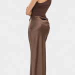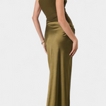Dizajnirana da istakne s vječnom elegancijom, ova duga plisirana haljina kombinira sofisticiranost i prisutnost u svakom pokretu. Njezin asimetrični izrez na jedno rame donosi modernu i rafiniranu notu, dok delikatni nabori padaju s lakoćom kako bi oblikovali impozantnu i ženstvenu siluetu. Izgled osmišljen za trenutke koji zahtijevaju distinkciju i sigurnost.