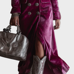 Ova duga, pripijena haljina-sako od vrhunskog baršuna zrači elegancijom i ženstvenim samopouzdanjem. Detalji s gumbima inspirirani vintage stilom i elegantno lepršava silueta daju joj jedinstven karakter. Strukturirana ramena i duboki dekolte stvaraju sofisticiran, ali senzualan izgled - savršen za svaku posebnu prigodu.