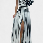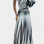 Haljina koja jednostavnost pretvara u stilsku izjavu. Valentina kombinira privlačnost asimetričnog dizajna s jednim ramenom i uzorak mekih pruga koji produžuju figuru i donose dinamiku. Lagana, fluidna i puna prisutnosti, idealna je za prilike kada želite istaknuti sofisticiranost bez napora.