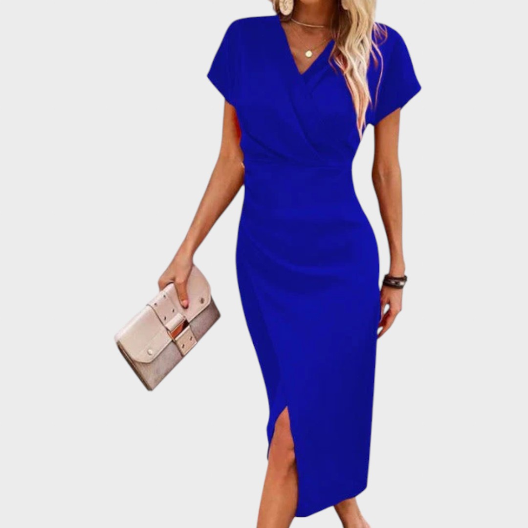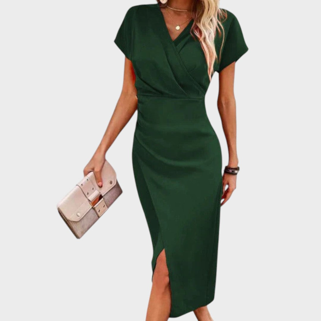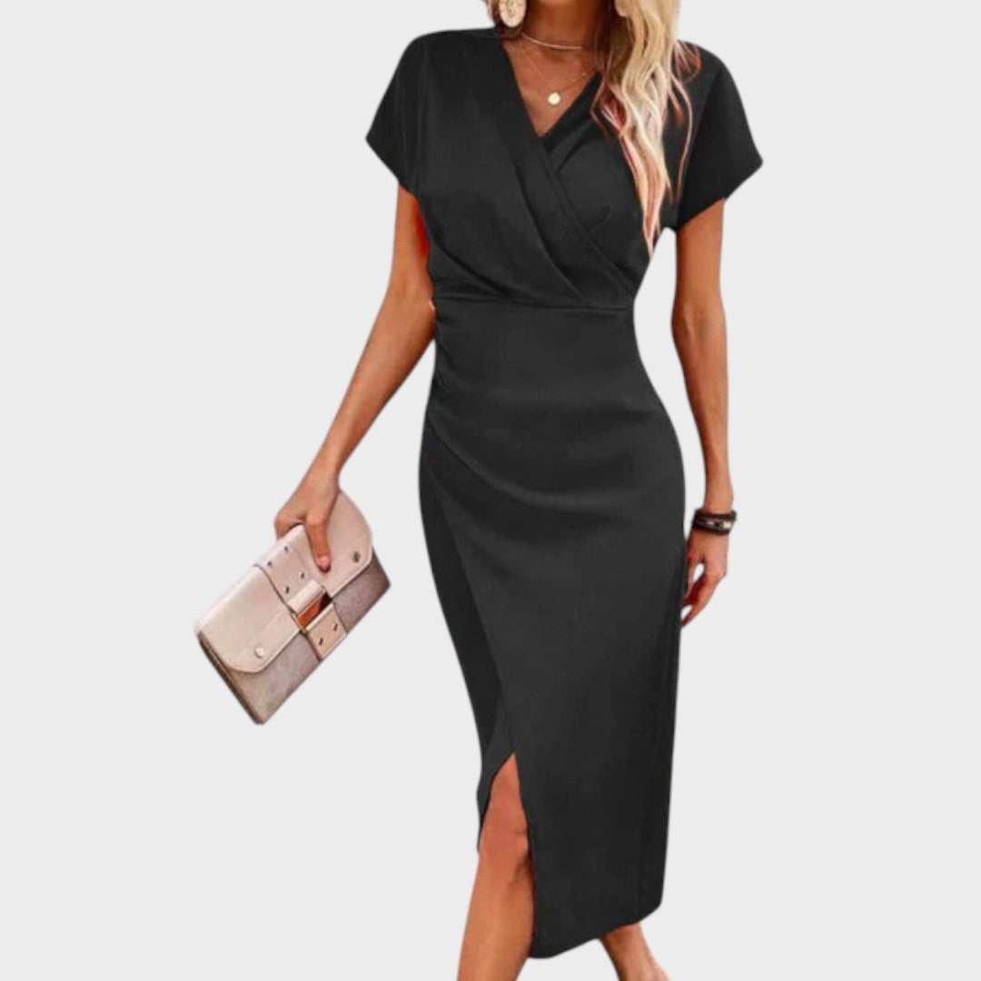 Ova elegantna midi haljina savršena je kombinacija profinjenosti i udobnosti. Preklopni kroj naglašava struk, dok decentni prorez dodaje dašak ženstvenosti i modernog šarma.