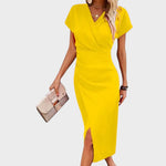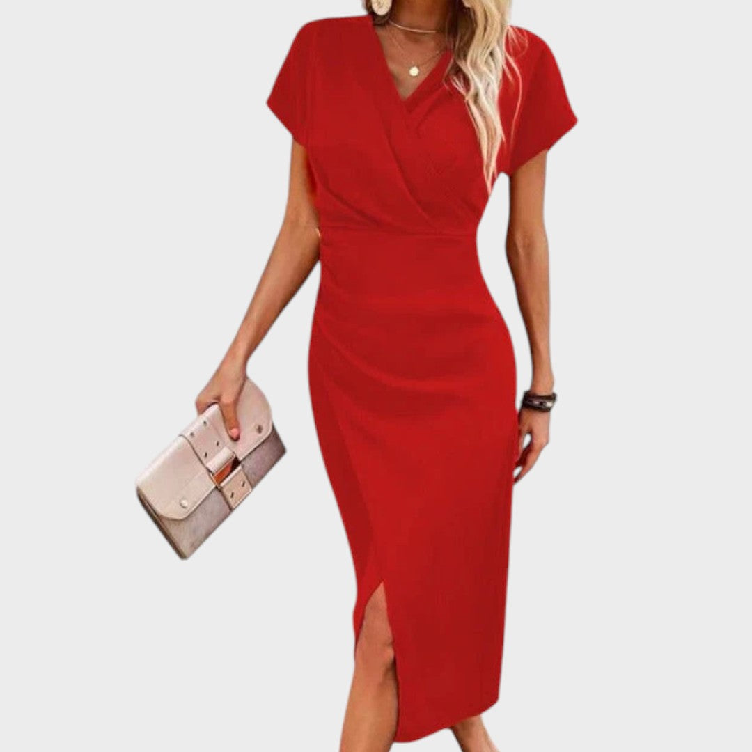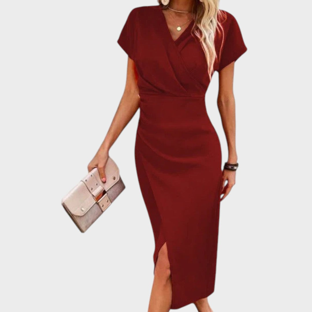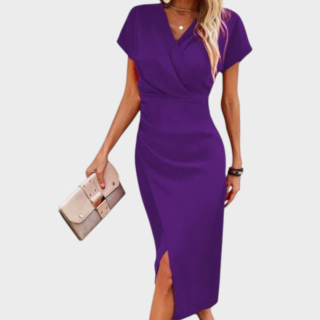 Ova elegantna midi haljina savršena je kombinacija profinjenosti i udobnosti. Preklopni kroj naglašava struk, dok decentni prorez dodaje dašak ženstvenosti i modernog šarma.
