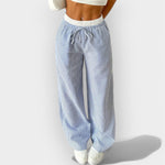 Moderne i nenametljivo elegantne, ove hlače širokog kroja s diskretnim prugama kombiniraju udobnost s jedinstvenim stilom. Idealne za šetnje gradom ili ležerne pojave s karakterom, nude slobodu kretanja i posebnu teksturu koja se ističe.