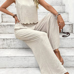 Laskavi gornji dio s elegantnim dizajnom i široke hlače daju profinjen, a ipak opušten izgled — savršen za razne prilike.