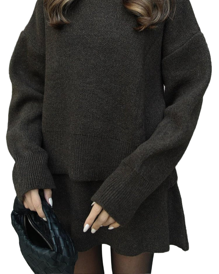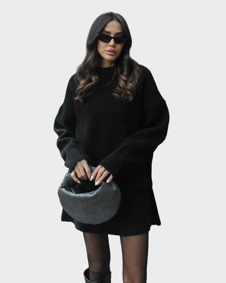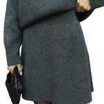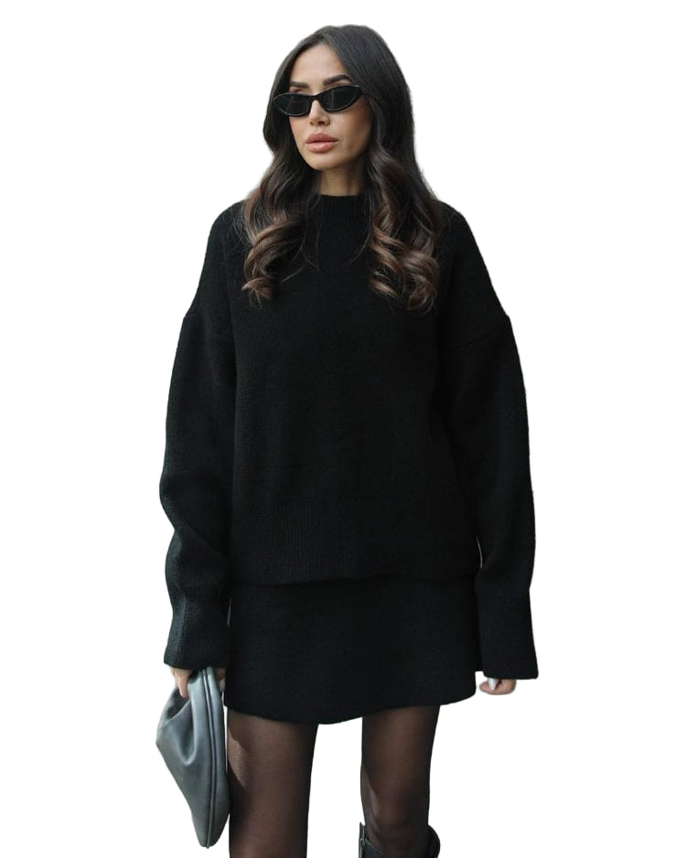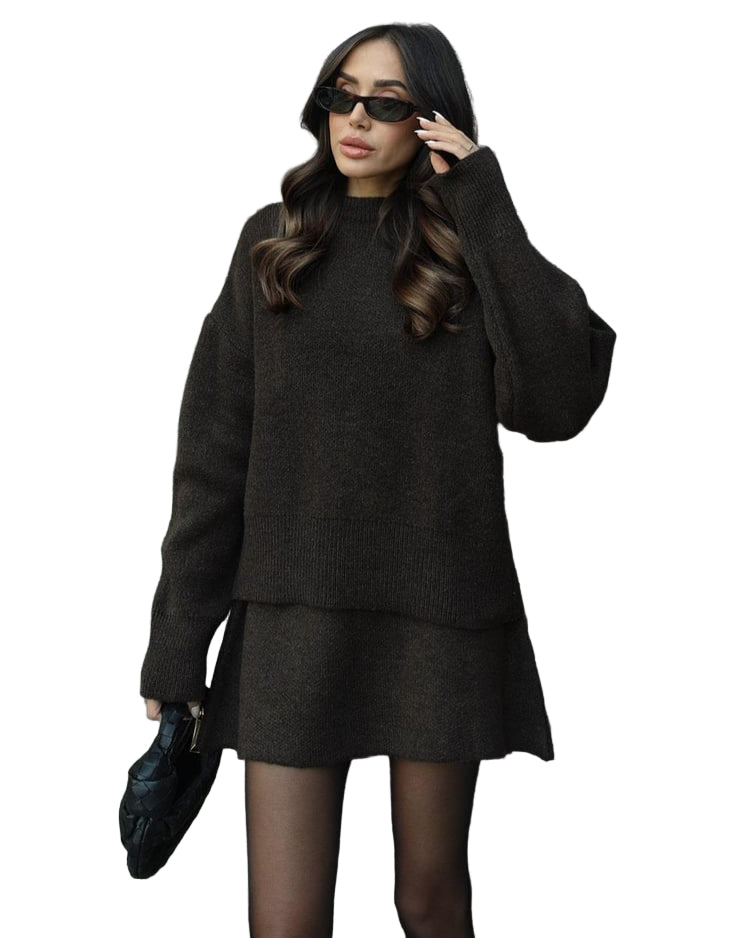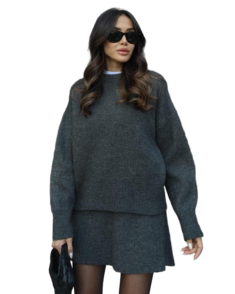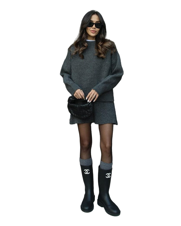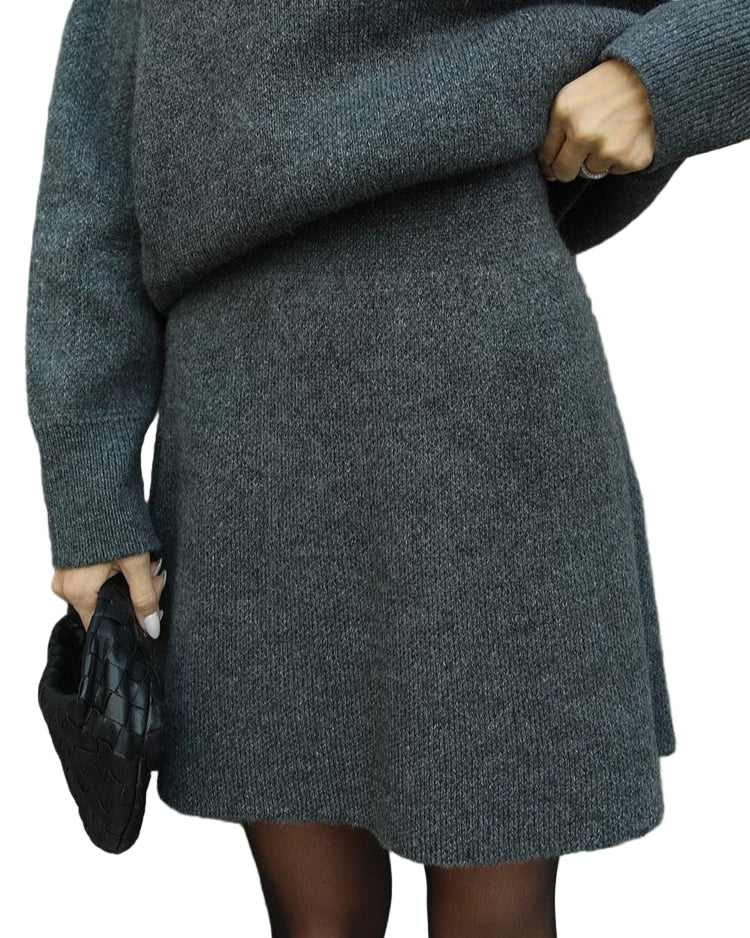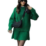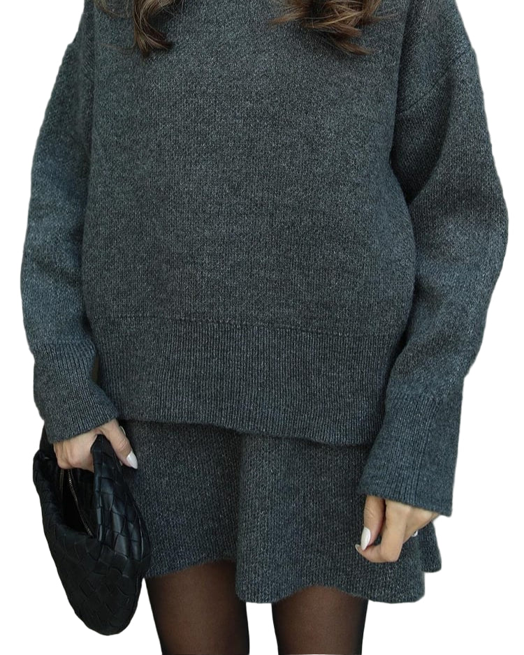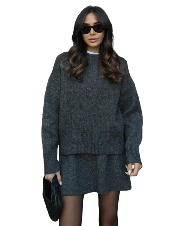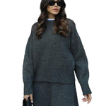 Mekani, fini plet, opušteni kroj i minimalistički dizajn čine ga vašim savršenim suputnikom za jesen i zimu. Džemper s okruglim izrezom i odgovarajuća suknja stvaraju elegantan izgled bez napora – savršen za ugodne dane ili elegantne večeri.
