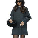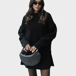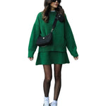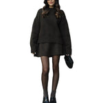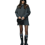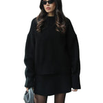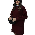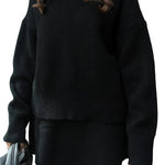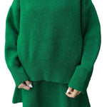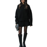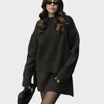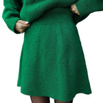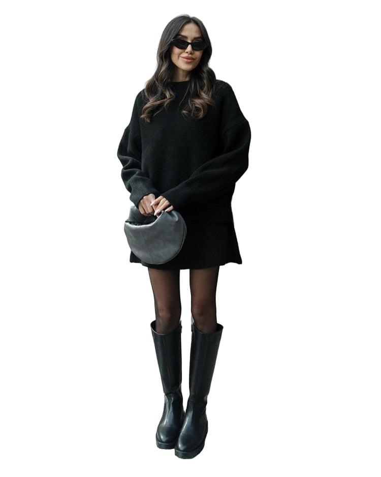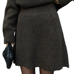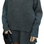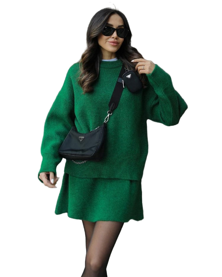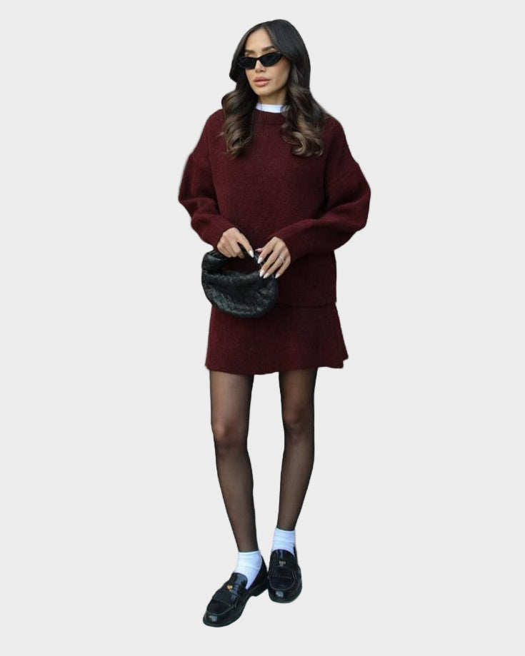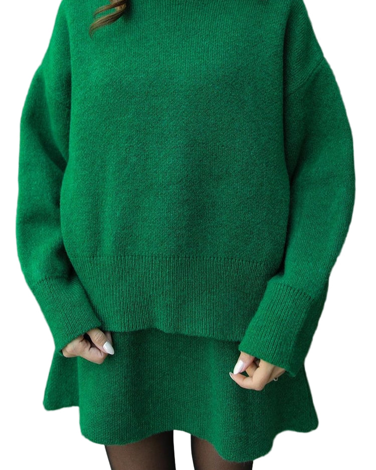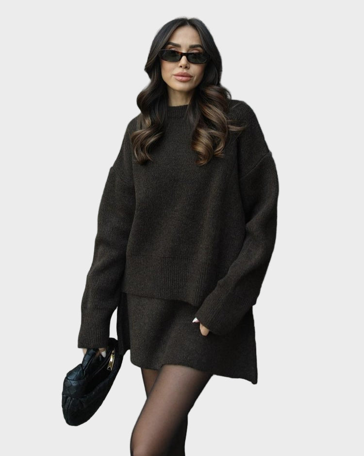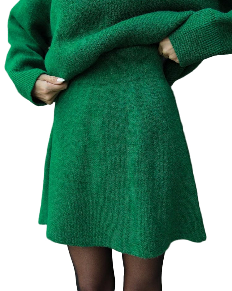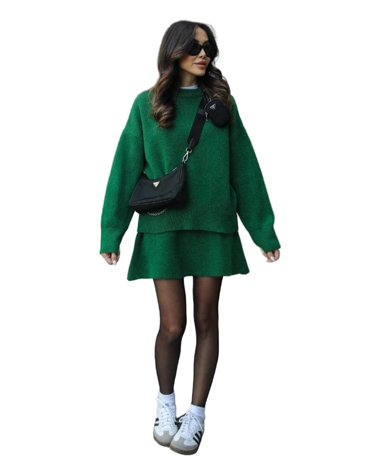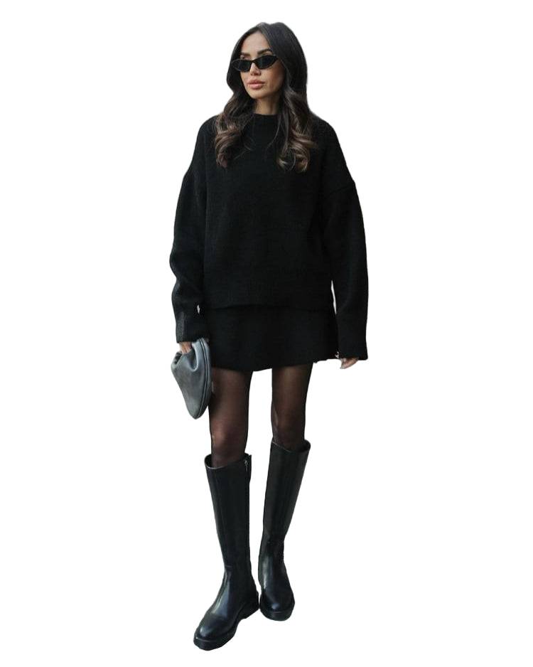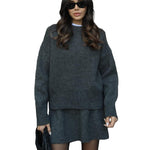 Mekani, fini plet, opušteni kroj i minimalistički dizajn čine ga vašim savršenim suputnikom za jesen i zimu. Džemper s okruglim izrezom i odgovarajuća suknja stvaraju elegantan izgled bez napora – savršen za ugodne dane ili elegantne večeri.