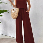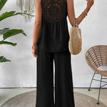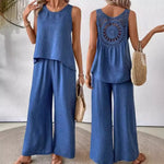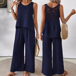 Ophelia kombinira stil i udobnost u profinjenom dvodijelnom setu. Laskavi top s elegantnim heklanim dizajnom na leđima i široke hlače stvaraju elegantan i bezbrižno šik izgled, savršen za razne prigode.