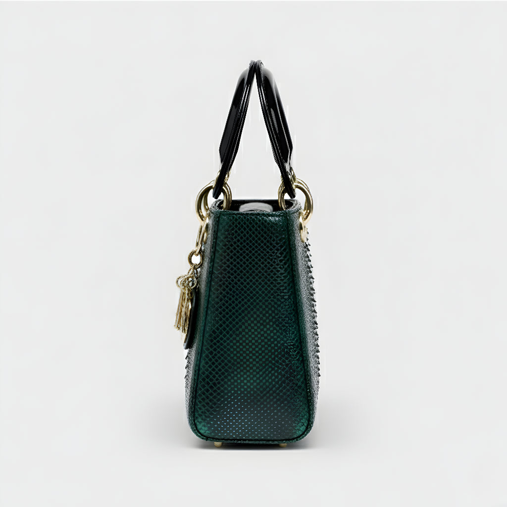 Sa sofisticiranim završetkom u životinjskoj teksturi i metalnim dijelovima visokog sjaja, ova torba je definicija profinjenosti. Strukturirana, s dvostrukim ručkama i dugom uklonjivom trakom, nudi svestranost koja odgovara od formalnih događaja do ležernih trenutaka sa stilom. Aksesor koji trenutno podiže svaku kombinaciju, donoseći šarm i autoritet.