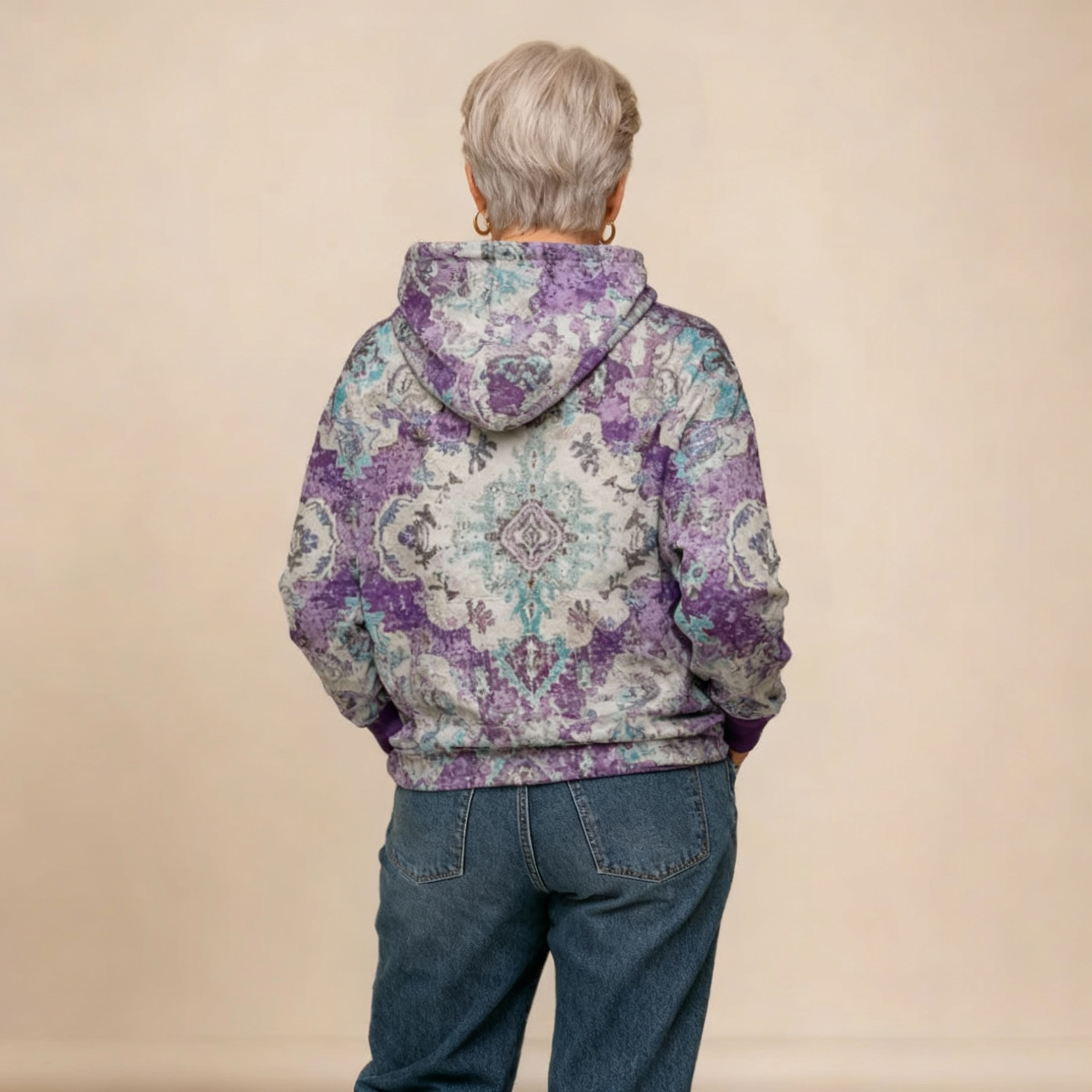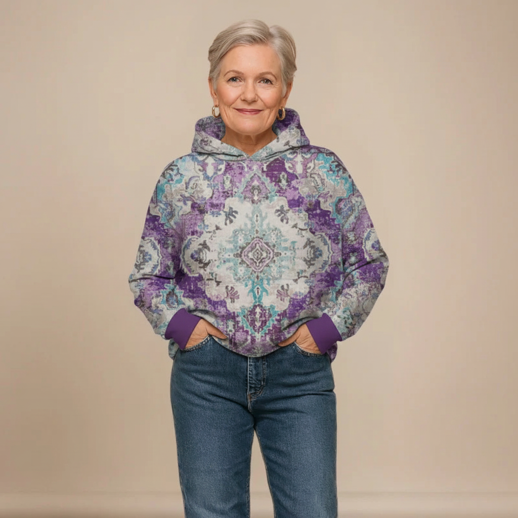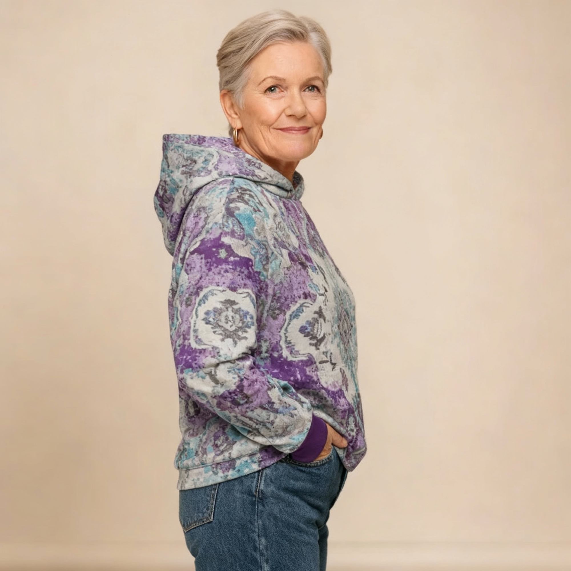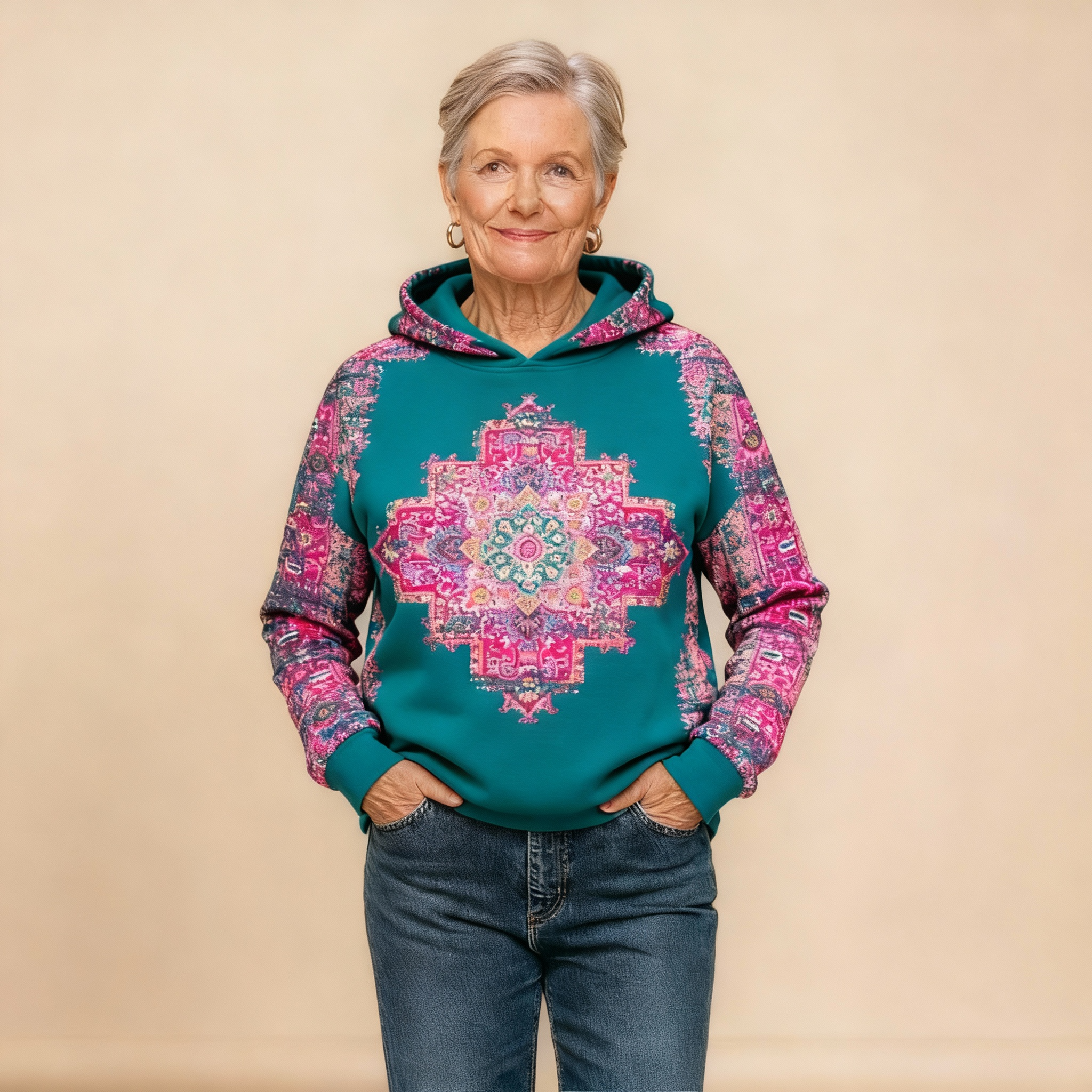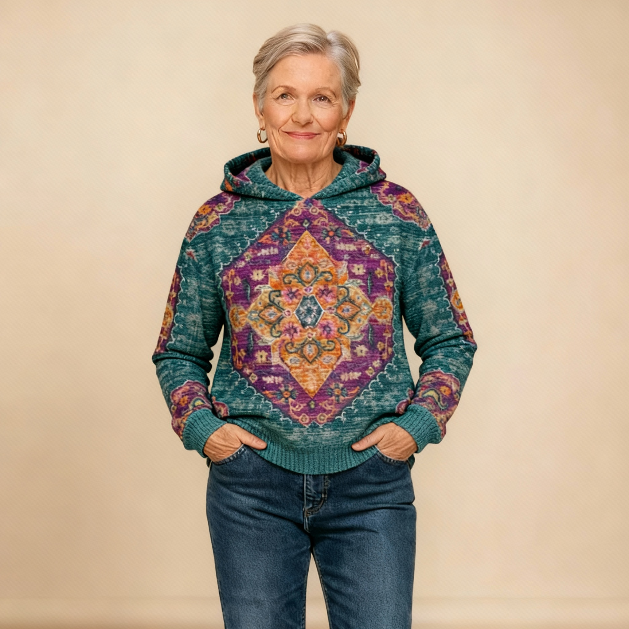 Ova pletenina ne grebe i ne iritira kožu zahvaljujući mekanoj, prozračnoj mješavini koja prija koži. Grije vas bez pregrijavanja, idealno za promjenjivo jesensko vrijeme. Materijal zadržava oblik – bez rastezanja ili opuštanja nakon nekoliko nošenja. Šareni, skandinavski nadahnuti uzorak dodaje razigran, a ipak moderan dodir svakom outfitu. Uparite ga s trapericama ili kratkim hlačama za ležeran look, ili ga podignite uz suknju i čizme. Kapuljača pruža dodatnu toplinu i opuštenu atmosferu.