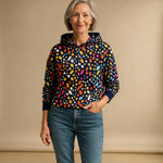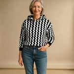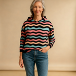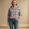 Ova pletenina ne grebe i ne iritira kožu zahvaljujući mekanoj, prozračnoj mješavini koja prija koži. Grije vas bez pregrijavanja, idealno za promjenjivo jesensko vrijeme. Materijal zadržava oblik – bez rastezanja ili opuštanja nakon nekoliko nošenja. Šareni, skandinavski nadahnuti uzorak dodaje razigran, a ipak moderan dodir svakom outfitu. Uparite ga s trapericama ili kratkim hlačama za ležeran look, ili ga podignite uz suknju i čizme. Kapuljača pruža dodatnu toplinu i opuštenu atmosferu.