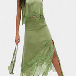 Set koji zrači pokretom, svježinom i bezvremenskom sofisticiranošću. Nada kombinira midi suknju s delikatnim čipkastim panelima i asimetričnom porubom koja donosi fluidnost u svaki korak, uz usklađeni top koji uravnotežuje eleganciju i modernost.