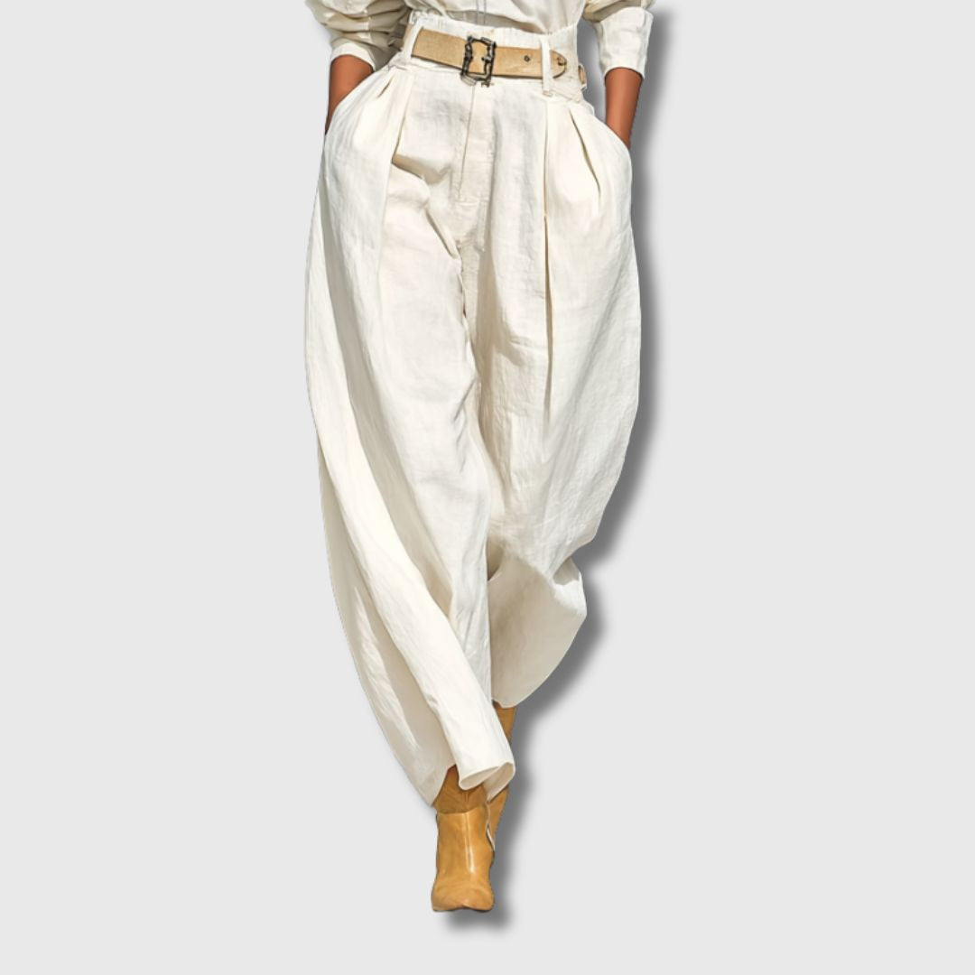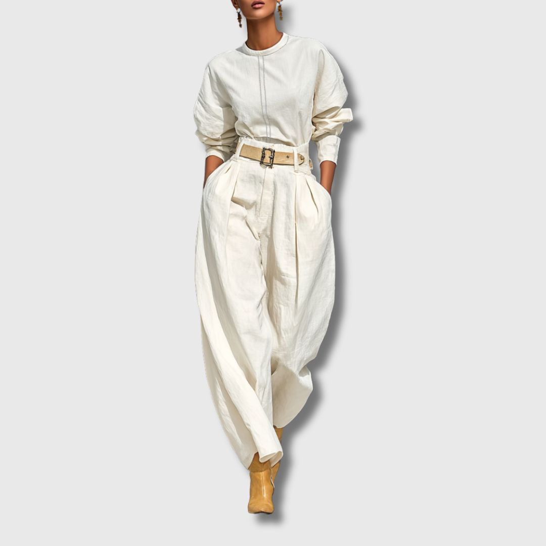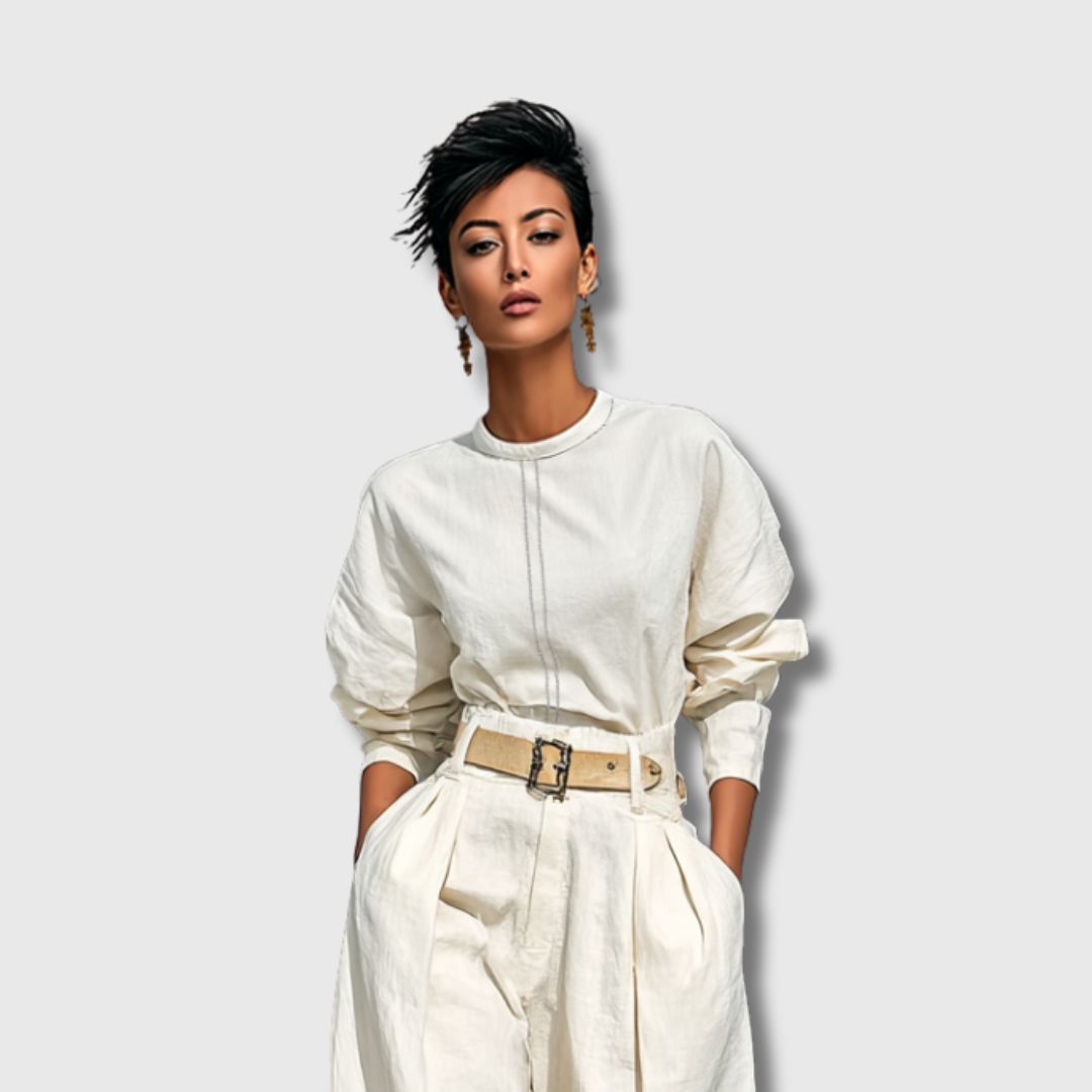 • Elegantna udobnost – Široke hlače i klasična košulja naglašavaju bezvremenski stil.