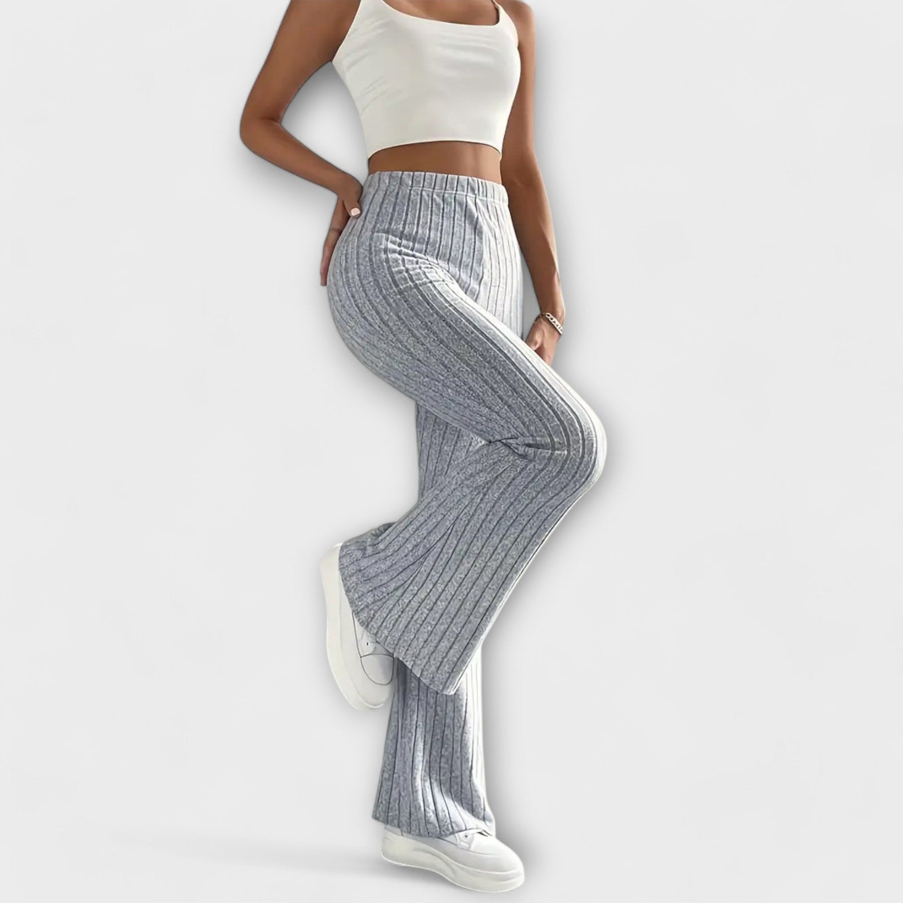 Sa rebrastom teksturom i flare krojem, ove hlače spajaju udobnost i eleganciju u jednom komadu. Tkanina se nježno prilagođava tijelu, ističući siluetu i osiguravajući potpunu slobodu pokreta. Savršene su za moderne i opuštene kombinacije — od ležernog izgleda do modno osviještenog stila.