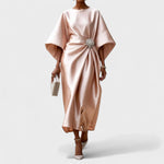 Duga večernja haljina skulpturalnog kroja s raskošnim, svilenkastim sjajem. Asimetrično drapiranje okupljeno elegantnom kopčom stvara efekt struka, dok prozračni, široki rukavi i fluidan pad tkanine osiguravaju graciozan pokret. Idealna za gala događaje, svadbene svečanosti i sve večeri kada želiš zasjati.