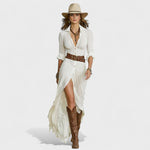 Ova elegantna maxi haljina izrađena je od pamuka i imitacije lana, s plisiranom suknjom i reverom. Prednji dio s jednim dugmetom i dugačke rukave stvaraju rafiniran i bezvremenski izgled, savršen za razne prilike.