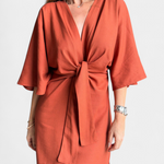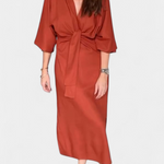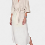 Jednostavnost koja očarava s siluetom osmišljenom da prirodno istakne. Haljina Natalija  kombinira duboki V-izrez s kimono rukavima i središnjim čvorom koji nježno naglašava struk. Njezina strukturirana tkanina i funkcionalan dizajn čine je svestranom i elegantnom osnovnom haljinom.