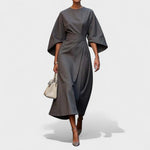 Rafinirana duga haljina s lađa izrezom i voluminoznim rukavima gradi profinjenu, arhitektonsku siluetu. Široki pojas ističe struk, dok raskošno padajuća suknja omogućuje slobodu kretanja i graciozan hod. Minimalistički detalji i čiste linije čine je savršenim izborom za svečane prigode, poslovne evente i večernje izlazke.