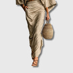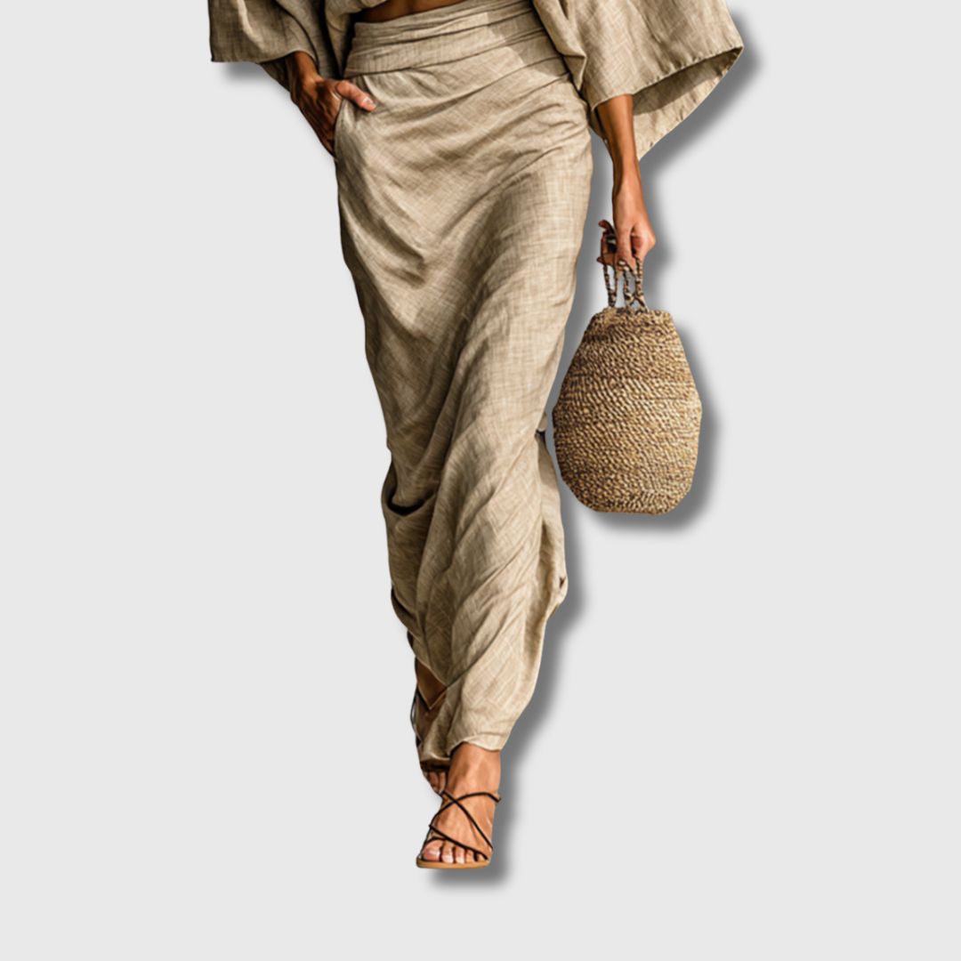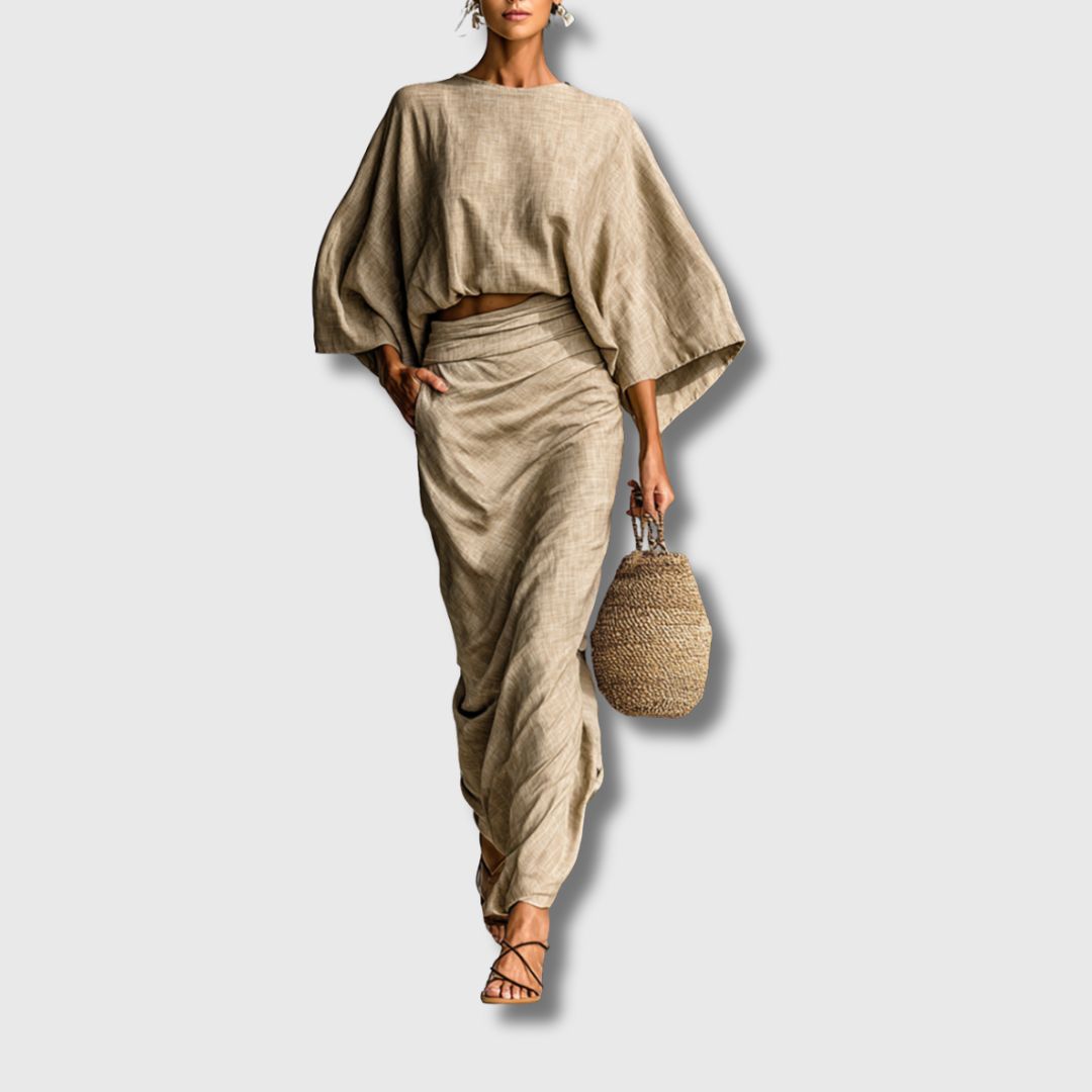 Ovaj ekskluzivni set od dva dijela spaja sofisticiran stil i maksimalnu udobnost. Bluza sa šišmiš rukavima pruža prozračnost i slobodu pokreta, dok duga suknja naglašava ženstvenost i eleganciju. Kombinacija pamuka i lana čini ga savršenim izborom za tople dane, poslovne prilike ili ležerna druženja.